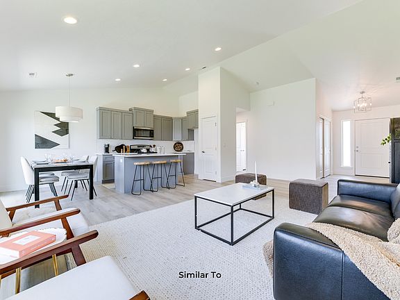 In the 1403 floor plan, you'll be greeted by the grandeur of the high vaulted ceiling in the great room, seamlessly flowing into the spacious kitchen and dining area. Flooded with natural light from the large window and patio slide door, this space feels open and inviting. Conveniently located near the garage entrance, the laundry room offers ease and functionality. Retreat to the main suite featuring a dual vanity bathroom with options for a fiberglass shower or customizable tiled walls. Plus, indulge in the dream-worthy walk-in closet. At the opposite end, two bedrooms share a well-appointed bathroom.