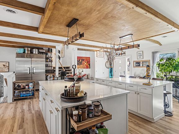The expansive kitchen area is a true highlight, featuring modern finishes and a seamless flow into the open-concept living spaces. Soaring tall ceilings and striking beams enhance the dramatic feel of the home, while the full glass garage door opens up to the living room, bringing the outdoors in and flooding the space with natural light.