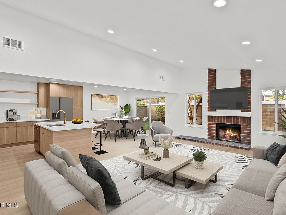 Modern Touches: complete remodel of the kitchen and bathrooms starting with an amazing open-concept kitchen complete with all new cabinets, quartz countertops with light gold & black veins, modern handles, stainless steel appliances, ample storage space and a spacious center island - great for entertaining. Large family room with fire place adjacent to the kitchen and dining area.