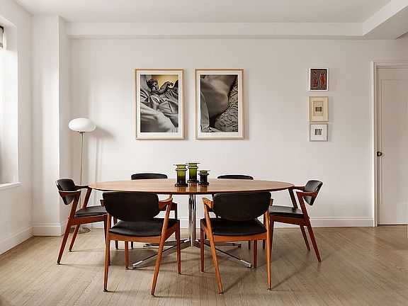 Perched on the ninth floor of a classic Art Deco cooperative, this two-bedroom, two-bath pre-war residence offers a quiet, confident sense of elegance. From the moment you enter the gracious foyer, the home opens into a corner living room with high beamed ceilings, original strip oak floors, and generous proportions that easily accommodate both daily life and formal dining.