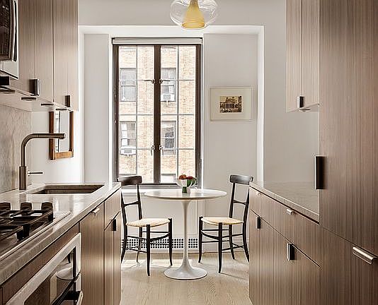The kitchen, thoughtfully reimagined by its architect-artist owner, strikes a smart balance of beauty and utility—with high-end appliances, sleek built-ins, and a west-facing bistro nook perfectly placed to catch the glow of the setting sun over the Hudson.
