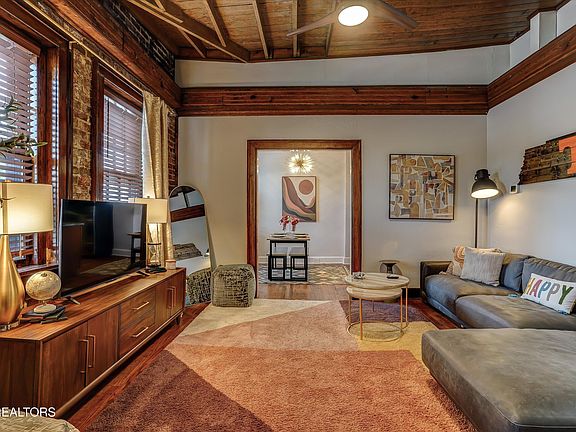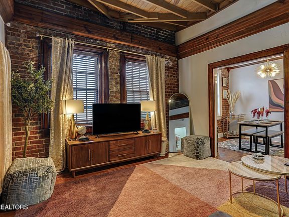 Experience the best of downtown Knoxville living in this stunning top-floor corner unit at the historic Lucerne building in the Old City. This 1-bedroom, 1-bath condo is filled with character—soaring ceilings, exposed brick walls, original hardwood floors, and a wood-paneled ceiling in the living room. With 7 oversized windows, the home is flooded with natural light throughout the day.