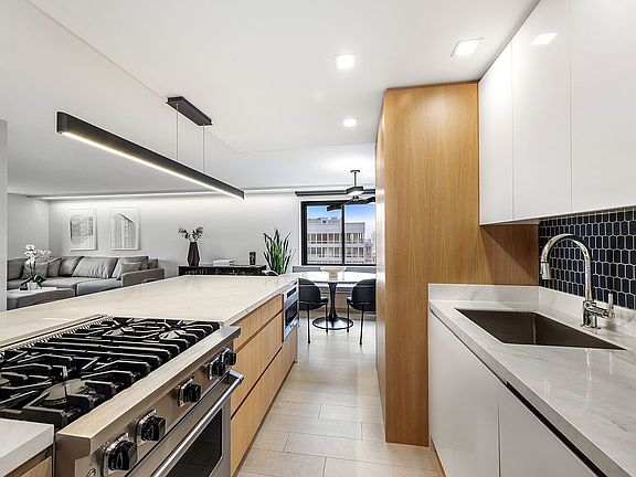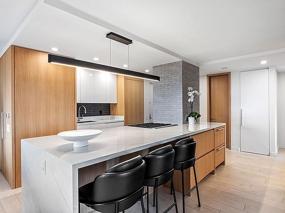 Step into a serene, beautifully curated space wrapped in Phillip Jeffries wallcoverings and white oak floors. Custom millwork, overhead lighting, and soundproof doors enhance the sense of privacy and refinement throughout. The spacious living room flows seamlessly for entertaining or relaxing, bathed in western light, with a wall of windows and a formal dining nook that comfortably seats six beneath open-sky views. The private balcony is your front-row seat to the sunset.