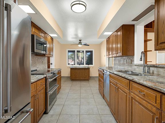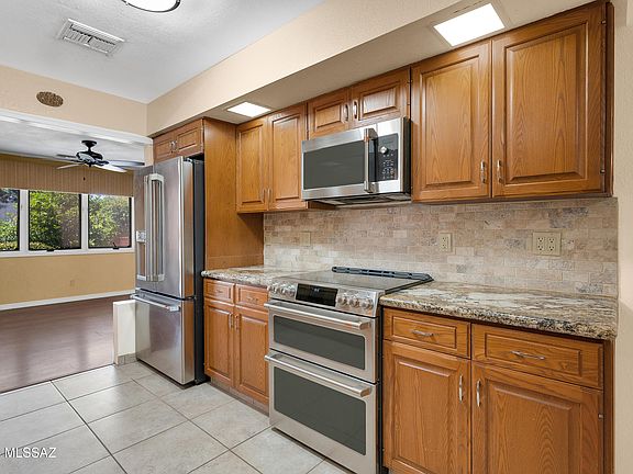 Nestled in a peaceful neighborhood just minutes from shopping, dining, and everyday conveniences, this thoughtfully upgraded residence offers the perfect combination of comfort, efficiency, and active adult living. As a member of Green Valley Recreation (GVR), you'll enjoy access to a wide array of clubs, social activities, fitness facilities, and pickleball courts--perfect for those seeking a vibrant lifestyle in Arizona's ideal year-round climate. From the moment you step inside, you'll appreciate the many tasteful upgrades and improvements that set this home apart. Popcorn ceilings have been removed for a more modern look, while newer ceiling fans in the living and dining areas enhance airflow and comfort. The kitchen features granite countertops, updated tile flooring, and a custom-built island designed as a dedicated baking centerideal for culinary enthusiasts. The inviting living room centers around a striking stacked stone wall and cozy gas fireplace, replacing the original wood-burning unit for added convenience and style. Both guest and office/bedroom spaces feature durable stamped concrete flooring, offering a unique and low-maintenance aesthetic. The versatile guest bedroom is perfect for accommodating visitors or converting into an office or hobby space. Step outside to your private backyard oasis, where mature landscaping, including lemon and navel orange trees and two towering ash trees, creates a lush, tranquil setting. A charming pergola offers the perfect spot to relax or entertain under the Arizona sun. Additional upgrades include: Owned solar panels for energy efficiency and long-term savings. All-new GE Café kitchen appliances. Epoxy-coated garage floor and added garage cabinetry for extra storage. Fully remodeled primary bathroom for a spa-like retreat. Updated tile flooring in the kitchen, laundry room, and entryway. Newer water heater (2019) for added peace of mind. This home is a rare findsolidly built, beautifully maintained, and move-in ready with every detail thoughtfully considered. Whether you're looking for a seasonal retreat or a full-time residence, this property offers the lifestyle, location, and features today's buyers are seeking.