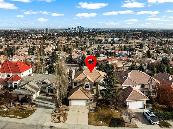 ** Check out the video** An extraordinary opportunity to own this custom-built home on a massive 9504 sq. ft. lot in sought after Signal Hill offering million-dollar panoramic views of downtown Calgary from all three levels! This executive home offers 3421 sq. ft. of developed living area on three levels including a bright walk-out level. Spacious two storey foyer. Formal living room with west bay window. Spacious dining room with cantilever and large east window offering stunning expansive views of downtown Calgary. Main floor Den provides the perfect home office. Well-designed kitchen is a chef’s dream featuring an abundance of oak cabinets, wall pantry and stainless-steel appliances, including double wall ovens. Timeless granite counters include a central prep island with ceramic cooktop surface unit. Additional counter area provides the perfect coffee station. Bright and sunny breakfast nook with bay window that offers views of the expansive yard and panoramic views of downtown Calgary. French door opens to a raised deck making this easy for summer entertaining. Inviting family room with gas fireplace and city views is perfect for casual gatherings. Convenient foyer off the attached garage features a two-piece bathroom, storage closets and laundry room with sink and counters. Double door entry to the expansive primary retreat, features a spacious bedroom area with walk-in closet. Enjoy the night lights from your sitting area with bay window. Five-piece ensuite bathroom featuring double marble vanity, separate make-up vanity, corner jetted tub and large walk-in shower. Three additional large bedrooms and four-piece bathroom compliment the second floor making this the perfect family home. A well-designed lower walk-out level with family room and media room with gas fireplace. Bright fifth bedroom and three-piece bathroom with steam shower. Additional upgrades include two furnaces and hot water tanks (2020). Two central A/C units, central vac. and water softener. An abundance of lower storage. Oversized double attached garage. An exceptional 182’ deep private lot with mature trees and landscaping. Located minutes from two LRT Stations plus schools, shopping, parks and pathways. Enjoy the outdoors at Griffith Woods Park and with the convenience of the ring road, you can be in Kananaskis Country in less than an hour!