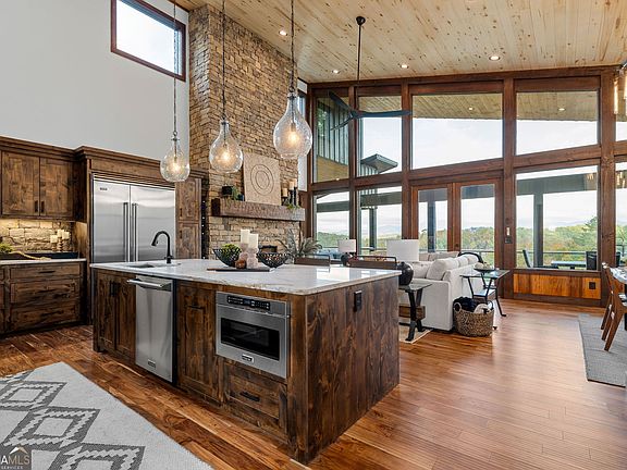 Step into a masterpiece where natural light pours through expansive walls of glass, highlighting the warm tones and inviting atmosphere. The grand entrance leads to an open-concept floor plan with beautifully finished hardwood floors and a striking floor-to-ceiling stone fireplace, perfect for cozy nights or grand gatherings. This stunning home offers 4 spacious bedrooms and 4.5 luxurious bathrooms, each thoughtfully designed to ensure privacy for all family and guests. The heart of the home features two fully-equipped kitchens, ideal for entertaining, and 1,300 square feet of covered deck space, two outdoor fireplaces, and expansive views. You will enjoy year-round outdoor living in luxury! Situated on a private 5+/- acres, and located In between Blue Ridge and Ellijay! Every detail has been carefully curated by Kevin Teague Custom Homes to create a home that blends style, functionality, and elegance. Welcome to your forever home!