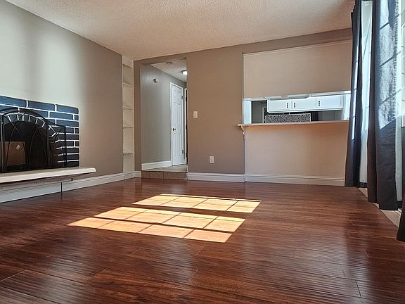 Brick-accented fireplacePrivate balconyBreakfast barLarge windowsWood-style flooringDedicated dining areaBuilt-in shelving