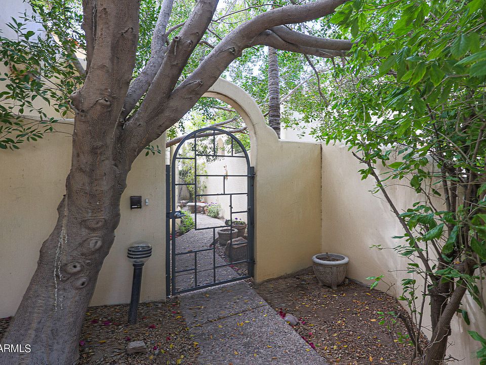 Discover your dream home with breathtaking views in one of the most sought-after neighborhoods in the valley Villas Encantadas. This exclusive gated community boasts charming villas that feature authentic American Southwest architecture. As you step inside, character and warmth greet you with gorgeous Viga and Latilla vaulted ceilings in the great room and kitchen, complemented by warm wood flooring throughout. Large family room with an abundance of natural light controlled by remote control roller shades. The beautifully updated kitchen is a culinary masterpiece with custom cabinetry, high-end SS appliances, built in Sub-Zero, induction stovetop, instant hot water and Quartz counters. The split plan offers two spacious bedrooms and two and half baths, architecturally stunning office and a walk-out patio perfect for barbeques or morning coffee. Unwind in the luxurious master bedroom featuring a custom built-in closet and ensuite bath with double vanities, a walk-in shower, and a garden tub. Professional garage floor coating and plenty of storage complete this centrally located luxury home. Great freeway access to Downtown, Biltmore Fashion Park, the Airport, and an array of outdoor activities. Enjoy all the great hiking, biking, and walking trails of the Phoenix Mountain Preserve. Don't miss your chance to own this stunning villa; schedule your tour today! There is an opportunity to extend the back patio/yard ask me more about this.