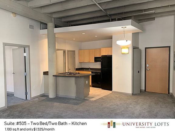 Apartment #505 is on the top floor of the building and features a private balcony with two large bedrooms on opposite sides of the apartment. Each bedroom comes complete with large closets and adjoining bathrooms. Enjoy the rustic feeling of exposed brick as a feature element in the living room and guest bedroom. This apartment features two coat closets and a washer and dryer in suite. About University Lofts: Discover downtown's best kept secret for unique and contemporary living. The community at University Lofts offers thirty loft style suites which are a perfect blend intimate and handcrafted urban living. This historic building was recently redone with visually stunning elements such as the exposed brick, private balconies, controlled access, on-site parking, in-suite washer and dryers, and more. Residents here often describe it as "high end condo living without the hassle of home ownership." Take comfort in knowing you have 24 hour on-call emergency maintenance, and an online portal for rent payments and more. The community sits on the edge of the Theater and Campus District with easy walk ability to cafes, restaurants, grocery stores, and there is even an Amazon store on the first floor of the building. Contact us today and arrange a tour, we would be excited to show you our options for your next home. Contact Information: