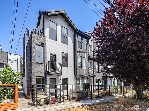 Sunlight floods this rare square-footprint end unit, wrapped in brick-accent siding—an uncommon touch with timeless appeal. Gated entry opens to polished concrete floors & easy entry-level living, with a flexible office space & adjacent bath for seamless work-from-home days or guest stays. Upstairs, plank hardwoods stretch wide, a Bertazzoni gas range anchors the chef’s kitchen, & a quartz island invites lively gatherings. Mini-splits on every level keep the vibe just right. Primary suite whispers retreat w/ a luxe standalone tub. Rooftop views sweep from Rainier to the Cascades. Gas hookup ready for grill nights or firepit stories. EV parking in back. Minutes to Ballard’s markets, festivals, and flavors—form, function, & freedom in one.