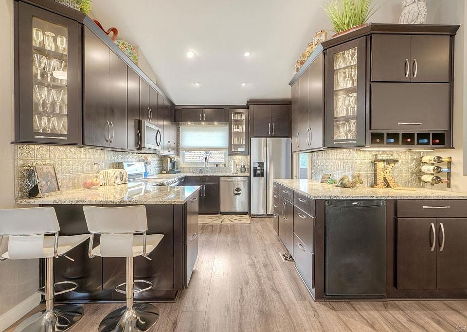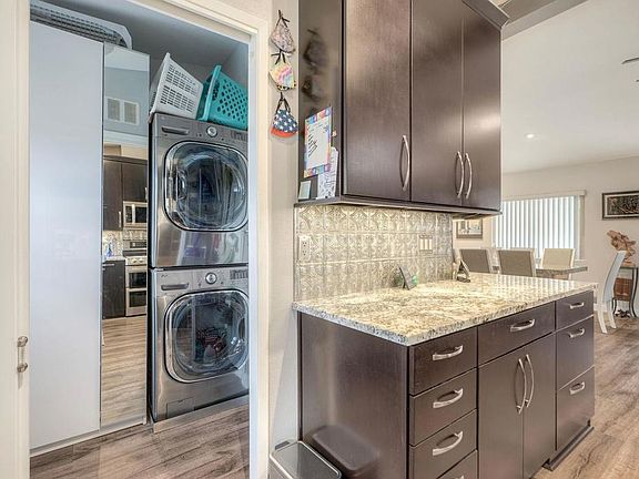 Stunning home beautifully updated! Home offers functionality with a long list of modern enhancements! Wall removed in kitchen to acquire a more open concept*Elegant recessed lighting*brand new kitchen contemporary finishes*granite counters*LED lighting*New flooring for a fresh cohesive look! Bar frig/ wine rack for entertaining* New refrigerator* Energy efficient SOLAR owned*New roof*Murphy bed*Primary remodel bedroom for efficiency*Gorgeous oversized shower with 2 shower heads custom remodeled room extremely efficient* custom front door* new windows with disappearing screens*Sought after west side location *direct access from garage to house*Garage cabinets/shelving *Spacious private yard with natural gas firepit boasting landscape lighting & overhead yard illumination an entertainers dream quiet/private* Own the land, own the house, gated senior community enjoy the ocean breezes!