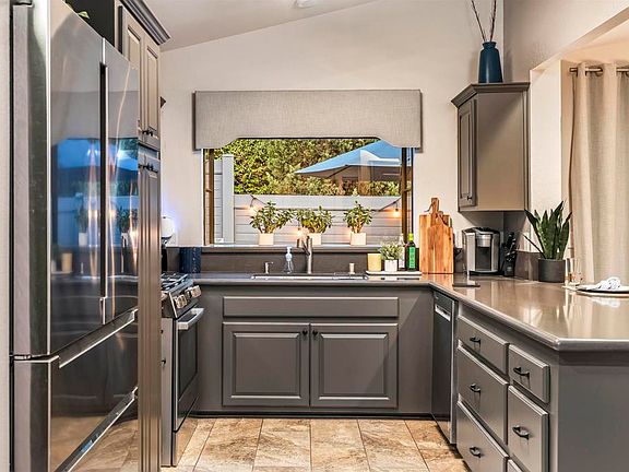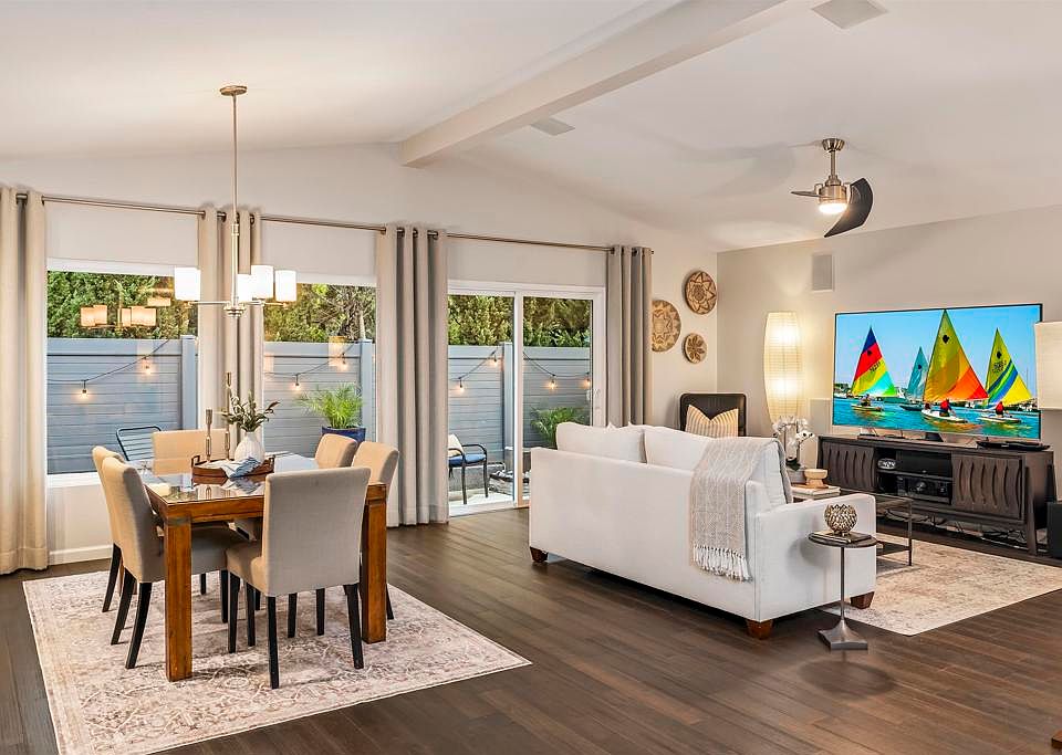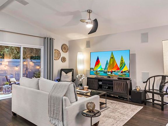 Delightful !! Charming!! Remodeled kitchen boasting high end appliances, quartz counter tops, eat in kitchen area* Amazing wood flooring* Dual pane windows accompanied by modern/conventional window treatments* Plantation shutters* Garden windows reveal the unique immaculate custom patio*Bull built in barbeque for entertaining enjoying this private yard* Pet friendly backyard enclosed for pet safety and charm*Newer HVAC* Surround sound*remodeled bathrooms with quartz counter tops*High end security screen door* Custom concrete surround the property*Spacious Primary suite with large walk in closet* 2 car garage with plenty of storage*Low maintenance yard*6 miles to the ocean*ocean breezes*close to restaurants, medical, Bressi ranch, restaurant row remodel with outdoor dining*Gated senior community*Immaculate price of ownership!