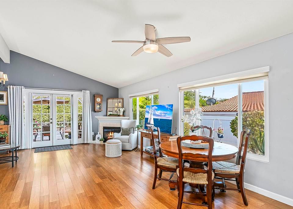 Charming remodel! Bamboo floors that open to an open floorplan where you can cozy around the fireplace* Dual pane windows bring in natural light*remodeled kitchen cabinets, counters, stainless appliances*2 bedroom 2 bath 2 car garage* This home has it all* French doors open to a gorgeous garden feels like a resort! Beautifully remodeled primary bath and secondary*Custom window treatments*OWN THE LAND*quiet location*Pride of ownership just charming!