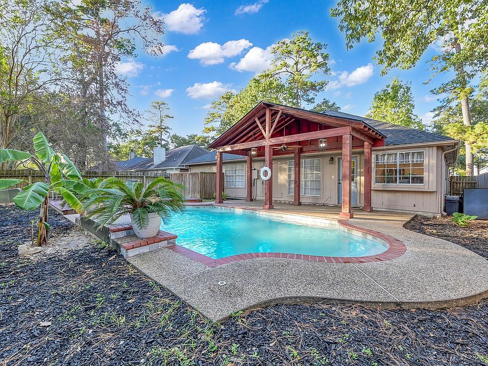 This charming 4-bedroom, beautifully updated home, is located in the front of Imperial Oaks, conveniently located to I-45 and the Grand Parkway 99. Lots of natural light, and a relaxing view of the pool from the kitchen and family room. Great indoor and outdoor space for family and friends. There is hard surface flooring throughout, luxury vinyl plank and ceramic tile, no carpet! Spacious layout with an open floor plan, formal living/dining in the front of the home (currently used for entertaining and billiards), and four bedrooms (you could also convert the front bedroom into a study). Brand new 50-year roof, large back patio structure 2022, expansive back decking 2022, and new pool plaster and tile 2021.