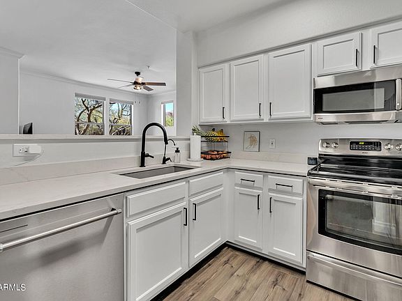 This gorgeous condo located in The Edge at Grayhawk is the perfect place to call home! The love and attention put into this home, with all the new updates gives, it a clean and timeless feel. NEW quartz countertops, New sink, New dishwasher, New vinyl flooring throughout, fresh paint, New baseboards, New window coverings, and New water heater. Walk into a bright, open living space with a beautiful kitchen including quartz counters, white cabinets, new hardware and stainless-steel appliances. The master bedroom boasts a large walk-in closet and private patio. This ground level condo is directly across from the community center and pool making it an incredibly convenient location. The Grayhawk community gives you access to 4 Pools, 2 Workout Facilities, Movie Room, and the Great Room!
