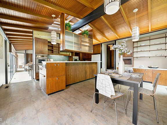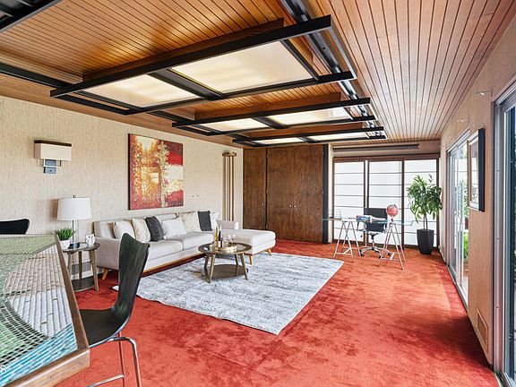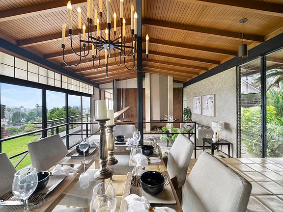 Step into the realm of architectural mastery with this Post & Beam Mid Century Modern marvel, envisioned by none other than John Andre Gougeon, AIA--an illustrious disciple of postwar minimalist architecture in sunny Southern California, apprenticed under the legendary Buff, Straub & Hensman. Nestled in a coveted locale, this residence commands awe-inspiring vistas of Mt. Baldy and the majestic San Gabriel Mountains. Boasting an impressive expanse of 3,000 sq. ft. across both main and lower levels, this 3BR/3BA sanctuary celebrates the fusion of expansive floor-to-ceiling glass and the warmth of wood, epitomizing unparalleled livability. Step inside to discover luminous interiors seamlessly melding with the outdoor landscape, a quintessential ode to quintessential California living. Exposed structural elements, gracefully extending from within to without, impart a crisp, invigorating essence to the home, casting delicate interplays of metal and shadow against the backdrop of terracotta tiles that span from the threshold to the patio. The foyer welcomes you, leading to a living space anchored by a fireplace that stands as a testament to impeccable craftsmanship, where brick, tile, and wood converge perfectly. Adjacent, a deck awaits, offering a front-row seat to valley panoramas. The kitchen, as beautiful as it is functional, a central island, breakfast bar, and a bounty of amenities including an oversized walk- in pantry, laundry room, and skylights, all seamlessly connected to the carport for effortless access. On the main level, three well-appointed bedrooms beckon, including a sumptuous master suite replete with a 3/4 bath, dual vanity, and a wealth of storage solutions, crowned by a private balcony retreat. Descend to the lower level--an integral part of the original design--where a Madmen-inspired family room unfolds, complete with a bespoke bar, ample storage, and glass doors that spill out onto the grass oasis, where patios and a verdant lawn await, inviting endless hours of living life.