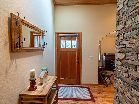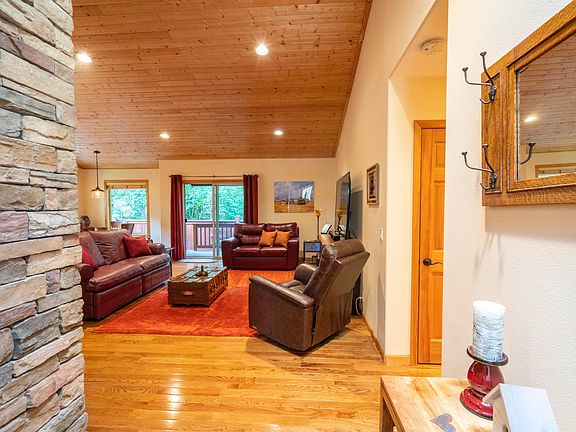 Discover this beautiful single-story home in Mountain Pines with captivating westerly views and sunsets. This quality custom home boasts tall pine vaulted ceilings, quartz counters, hardwood floors, custom wood trim throughout, a tile bath and spacious pantry. Gather around the see-through cultured rock gas fireplace for a cozy and inviting atmosphere. The large primary bedroom has a spacious walk-in closet and ensuite with soaking tub and shower. Plus there's a bonus room that could be used for flex space or an office. The exterior features are ideal for entertaining with a composite deck space, paver patio and sitting areas all within a fenced backyard. Both the back and sideyard are beautifully landscaped and include a water feature to provide tranquility. Another feature of this property is the long, oversized finished garage with epoxy floors and extra storage under the stairway. Don't miss this opportunity for luxurious living in a picturesque setting!