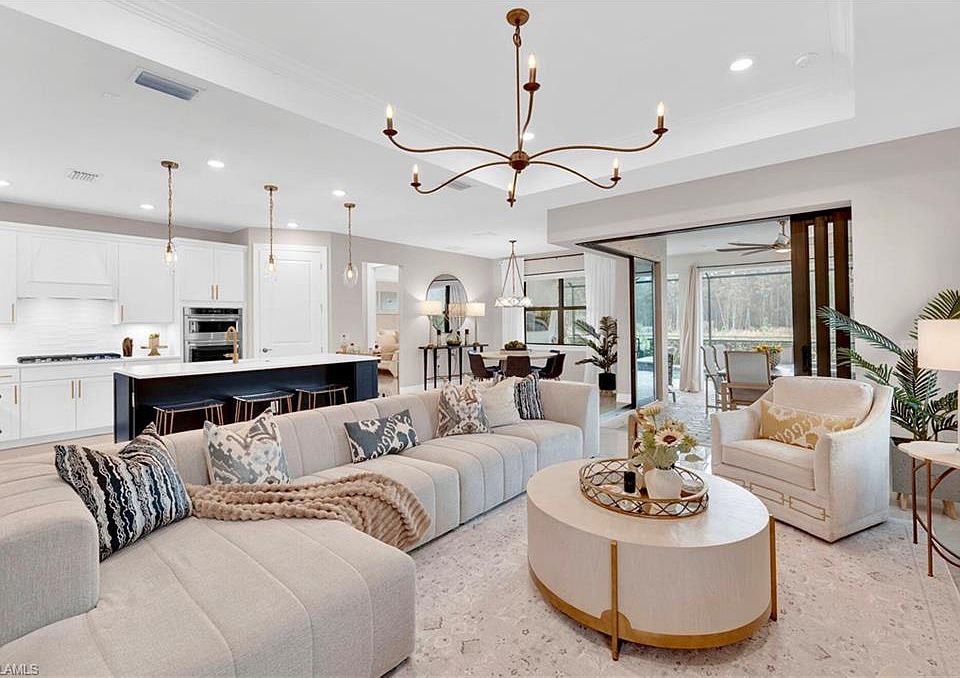 Full outdoor kitchenEnclosed denLeathered quartz countertopsSpa-like bathCovered extended lanaiZero-corner sliding glass doorsCustom cabinetry