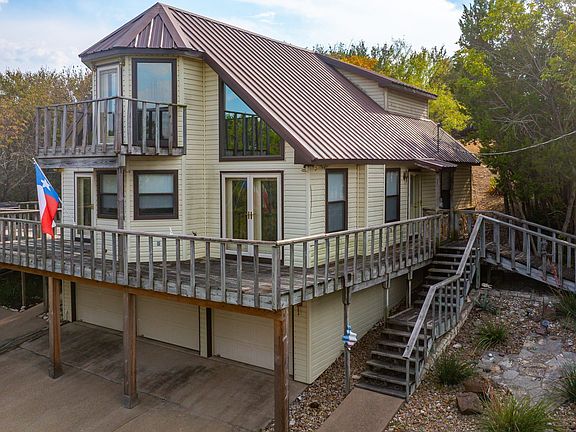 GREAT WATERFRONT PROPERTY! This a great opportunity to own a wooded waterfront house on the best part of Lake Granbury, in the county without an HOA but in the heart of Granbury. This could be your forever home, a weekend getaway, or a short or long-term rental. The main floor is open concept with a spacious living room and gas fireplace that flows into the kitchen and dining room. Off the living room, you will find 2 bedrooms and 1 full bathroom. The master bedroom and ensuite are on the upper floor which has an amazing view overlooking the lake from the game room. This home is an entertainer's dream with over 800 sq ft. of outside deck that wraps around the house. You will treasure the views from each level of this home as you savor your morning coffee watching the sunrise or relaxing for dinner as the sun sets. Stone steps will take you down to the large, covered, dock with a boat lift and 2 jet-ski lifts. Under the main floor, this unique property features an oversized 3-car garage for storage and parking cars and lake toys. If you are a golfer, the neighborhood includes a 9-hole public golf course. The options are endless. You can have fun in the sun on the lake with family and friends or take a short drive to the Town Square restaurants and attractions. Enjoy small town living and the convenience of being on the northeast side of the lake for easy access to Granbury shopping, grocery stores, and the main route to Forth Worth. Schedule your private showing today and take advantage of this incredible opportunity to own affordable waterfront property on Lake Granbury.