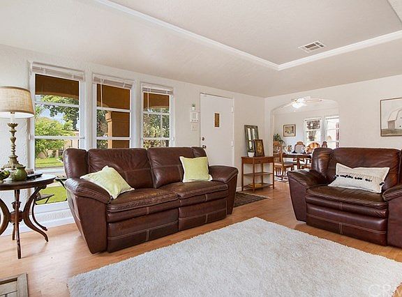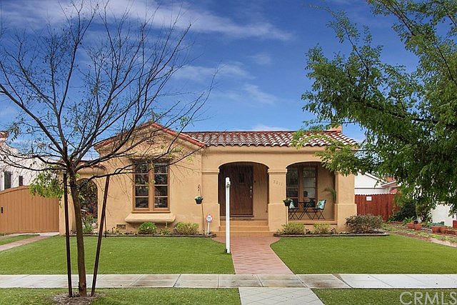If you're looking for Spanish revival architecture look no further. This Historic 1928 Spanish charmer is filled with arches, classic coves and built-ins. Abundant windows fill this home with natural sunlight. As soon as you enter the home you're greeted by the original fireplace with it's historic tiles and lovely charm. From the living area enter a spacious dinning room just begging for entertaining! Pass through the original swing door into the breakfast nook with an oversized window and a large built in cabinet, it's the perfect place to enjoy your morning coffee. Beautiful original hardwood floors in all three bedrooms. Original hardwood floors under the floated wood laminate in the living area are there to uncover or simply enjoy as is. The old arched telephone cubby really puts on the charm. The bathroom is a step back into 1928 with the original built-in vanity and ceiling arches over the shower and toilet. This home is located on a large lot. Sell your lawn mower and cancel your gardener. Both the front and backyard are expensive synthetic turf that looks just like the real thing! There is a good sized garage with a large tuff shed behind it. A high block wall gives you plenty of privacy. Cool off in the summer with central air or sit on your front porch with a glass of lemonade. Also, added to the list of goodies is a tankless water heater. Don't miss this one. It won't last long!