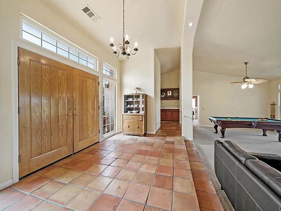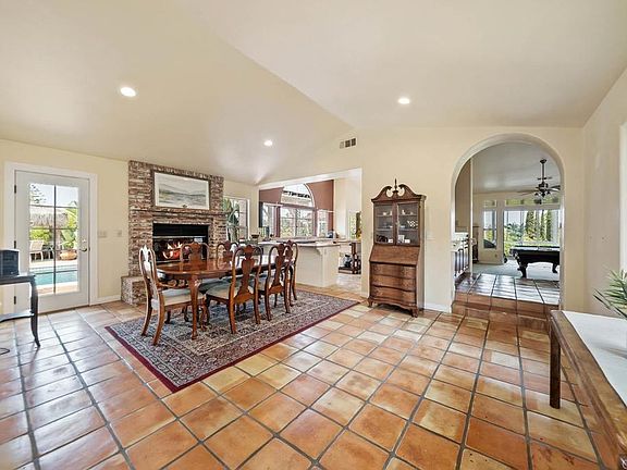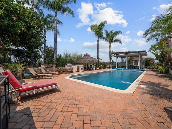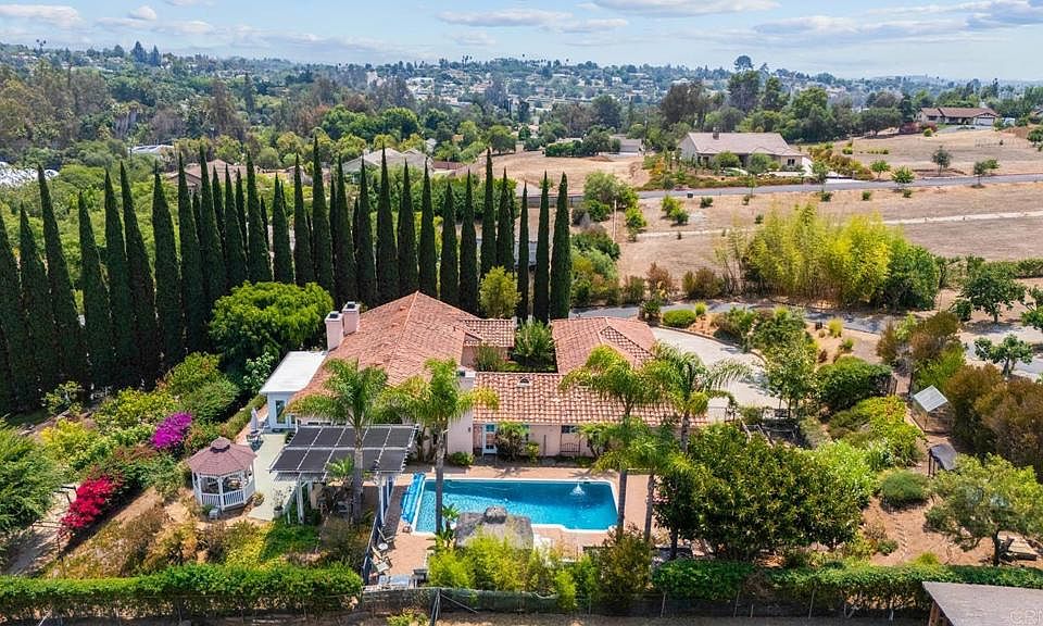 A dramatic gated driveway lined by mature Italian Cypress trees sets the tone for this sprawling single story and enchanting estate. This extensive property offers retreat-like living from the moment you arrive, featuring a welcoming succulent-lined courtyard that leads to grand double doors and soaring vaulted ceilings. Step inside and into the spacious living room with a fireplace that flows into the sunroom, surrounded by walls of windows that flood the home with natural light. These frame the captivating views of Palomar Mountain and overlook the 1.26-acre private oasis—with over 13 fruit trees—blurring the lines between indoor and outdoor living. The kitchen features granite countertops, a center island, stainless steel appliances with Wi-Fi-enabled GE double ovens, a Thermador gas stove with griddle, a roll-out pantry door, ample cabinet space, and a double sink overlooking the backyard pool and adjacent succulent garden. The kitchen effortlessly connects to the dining room, which is warmed by another fireplace and provides direct patio access. The backyard is an escape all its own, featuring a beautiful sparkling pool with a new pool cleaner, an outdoor built-in BBQ area with a grill, burner, prep area, and mini-fridge, and various dining options including a palapa, a covered outdoor dining area, and a gazebo. The orchard is a vibrant mix of mature avocado trees, lemon, orange, mandarin, pineapple guava, olive, fig, and apple trees, as well as blueberries, wild blackberries, dragon fruit, and table grapes. The upper garden boasts a greenhouse and chicken coop, while the lower yard provides tons of room for recreational activities and currently offers a play structure, volleyball area and open space. The primary suite is nestled in a private wing of the home, offering an exclusive sanctuary. This spacious haven features a cozy fireplace, walk-in closet, access door leading to a secluded outdoor patio. The ensuite bathroom offers dual sinks, a soaking tub, a separate shower, and an additional private outdoor access. Three additional bedrooms and one-and-one half bathrooms are found in the opposite wing of the house. This home is equipped with modern conveniences, including a central vacuum system, a wet bar, three gas fireplaces with heat exchange, a three-car garage with 220V wiring for EV charging, all new exterior doors, updated and recently upgraded irrigation system, fresh paint, and dual-zoned air conditioning and heating systems. The Halo whole house water treatment system ensures pure water throughout, and the Texcote exterior paint enhances energy efficiency. A detached artist studio with A/C and heat provides a perfect creative retreat, while the solar panels on a separate covered parking area contribute to energy savings. Experience the tranquility and luxury of Fallbrook living, with close proximity to several wineries including Monserate Winery, parks, hiking trails, dining, shops, and entertainment.