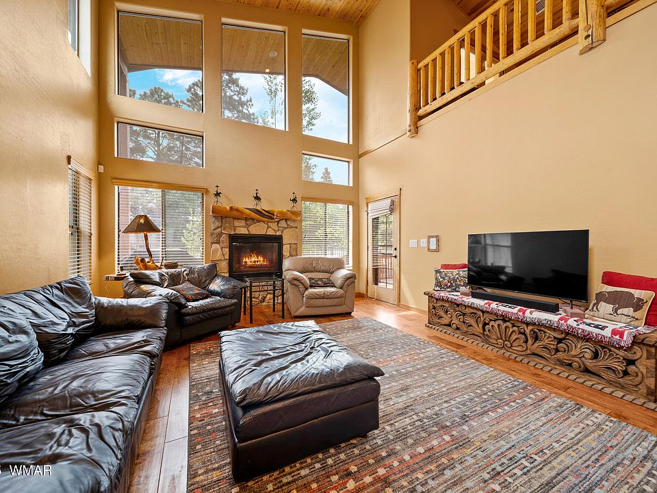 7 Day Min. for shortrental Spanning an impressive 2,338 square feet, this home is significantly larger than others in the community, boasting three bedrooms and three baths, coupled with an impressive stone fireplace adorned with a wood mantel. The upstairs entertainment loft area features a pool table and an upstairs covered balcony, perfect for relaxation or social gatherings. This community offers a peaceful retreat while keeping you close to the adventures at Rainbow Lake and the charming town of Pinetop-Lakeside, where hiking, fishing, boating, and golfing amenities are just moments away. The home is fully furnished and move-in ready, making it ideal for those looking for a lock-and-leave lifestyle or a cozy year-round residence. With its prime location and proximity to dining and entertainment options, this property is a rare gem that you won't want to miss!