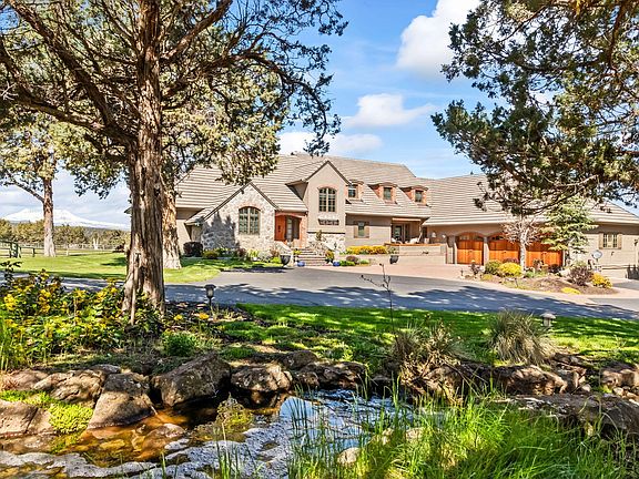 This stunning french country estate spans 5 full irrigated acres in the highly sought-after Winston Ranch area of Tumalo. The property offers dramatic views of the Cascade mountains, visible from nearly every window of the house. the home boast high-end finishes, including slab granite countertops, hardwood floors, large windows and a spectacular basalt rock fireplace. The completely remodelled kitchen is a must-see with high-end appliances, a double island, wine refrigerator and more. The primary suite is located upstairs, with guest bedrooms on the main floor and a 4th bedroom / flex room with adjoining ensuite over the garage. The private and unique setting includes a 3-stall barn, dry lt for horses, a shop with garage and RV/boat carport, underground irrigation, and a round pen adjacent to the lush, fenced pasture. This turn-key property is located just minutes from bend, offers a perfect blend of luxury and rural charm in Winston Ranch.