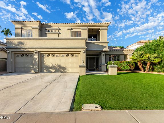 Stunning waterfront residence in Val Vista Lakes! Boasting a 3-car garage and a manicured grassy front yard, this home immediately impresses with its inviting curb appeal! Discover plantation shutters, high ceilings, bay windows, modern light fixtures, & carpet/vinyl floors. A spacious living/dining room is designed for elegant entertaining, while the family room features a cozy fireplace for relaxing evenings. Elegant eat-in kitchen has a prep island, built-in SS appliances, granite counters, subway tile backsplash, white cabinetry, & a pantry for storage. Downstairs, the basement offers the perfect entertainment hub with a built-in projector & surround sound speakers! Upstairs, the main bedroom suite is a luxurious retreat featuring a sitting area, surround sound speakers, a two-way fireplace, balcony access, two mirrored-door walk-in closets, & a lavish ensuite with dual vanities, soaking tub, & step-in shower. A den with French doors adds flexibility for a home office, library, or creative space! The backyard oasis comprises a covered patio, balcony, heated spa, sparkling blue pool, & lush grassy area, all perfectly oriented to showcase impressive lake views. Move-in ready!
