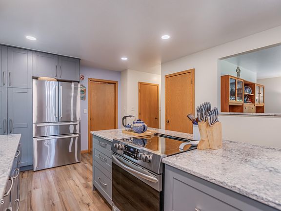 The main level features updated laminate flooring, a cozy living room with a gas fireplace, spacious dining area, and a beautifully remodeled kitchen. The kitchen boasts a large center island, breakfast bar, modern cabinetry, quartz countertops, and stainless steel appliances—perfect for entertaining or daily living. Also on the main floor: a versatile bedroom ideal for a home office, a convenient half bath, and a laundry room.