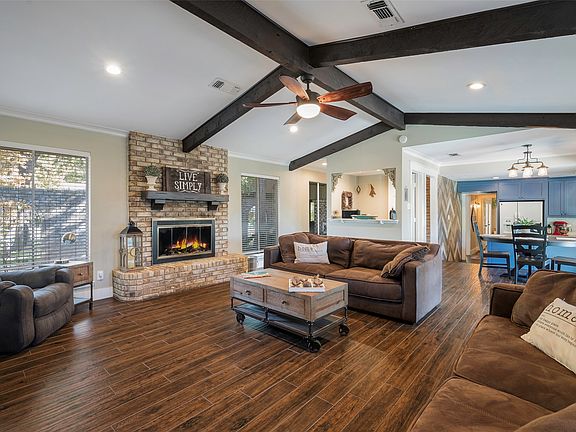 Inside, you’ll find multiple living areas, a warm and inviting fireplace, and a thoughtfully designed kitchen featuring a gas stove, ample cabinetry, and a farmhouse sink. The generous floor-plan includes a downstairs primary suite and offers flexibility for two home offices, kids’ spaces, or multi-generational living.