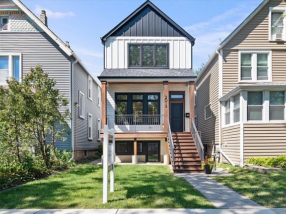 Stunning Newer Construction in Prime Evanston Location Welcome to 2012 Maple, a beautifully crafted single-family home that blends modern design with timeless details. The sharp exterior features board-and-batten siding, black-framed windows, and a charming covered front porch that sets the tone for what's inside. Step into a sun-drenched, open-concept living and dining area-perfect for both everyday living and entertaining. The chef's kitchen is a true showstopper, complete with professional-grade appliances, a large center island, butler's pantry, walk-in pantry, custom white shaker cabinetry with under-cabinet lighting, a herringbone tile backsplash, and sleek quartz countertops. The adjoining family room impresses with a coffered ceiling, custom millwork accent wall, and abundant natural light. A rear mudroom with built-in cubbies keeps everything organized. The second floor is home to a serene primary suite with designer accent wall, bedside sconces, two walk-in closets, and a spa-like bath featuring dual vanities, a spacious glass-enclosed shower, and a freestanding soaking tub. Two additional bedrooms, a full hall bath, and laundry complete this level. The finished lower level offers incredible additional living space with a large recreation room, full wet bar, spacious bedroom, full bath, and convenient laundry room. A two-car parking pad adds to the convenience. All this in an unbeatable location-just steps from the Purple Line, downtown Evanston, shops, groceries, restaurants, the lakefront, and more. 2012 Maple is the perfect blend of style, comfort, and location-ready to welcome you home.