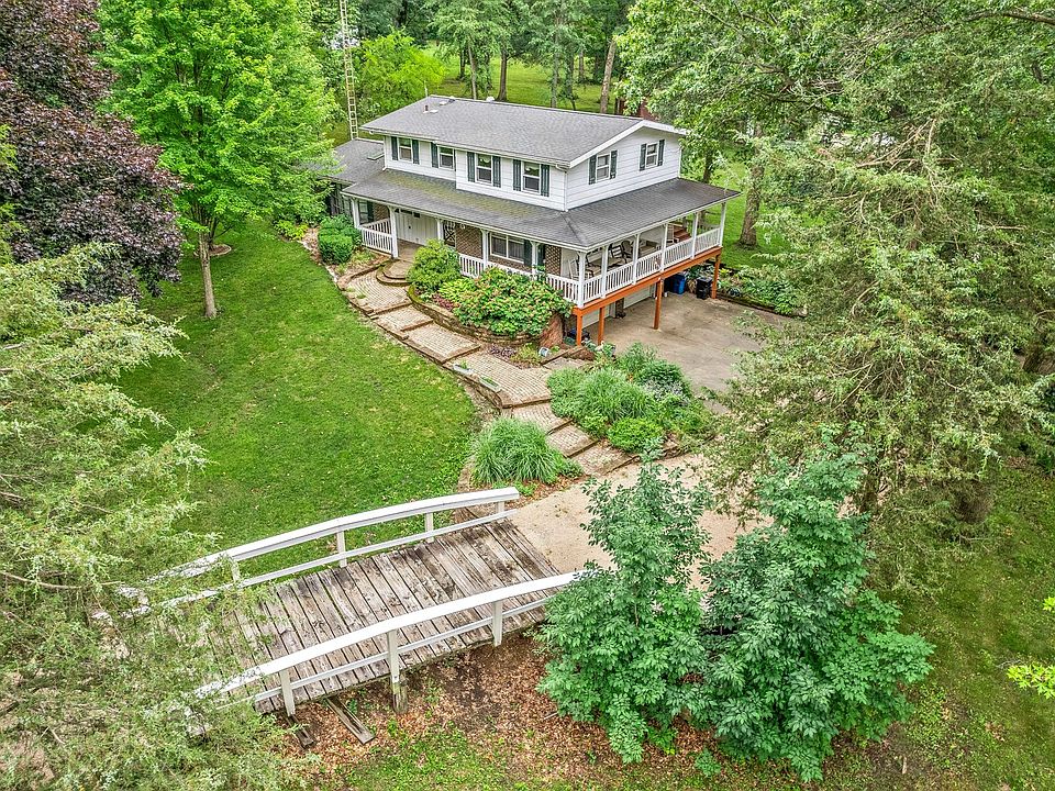 GREAT HOME on PICTURESQUE 3.9 ACRE SETTING 2600+ sq. ft. w/ 3 BR, 2.5 Baths, Large Eat-in Kitchen, 22 x 18 Family room, Hardwood floors in Kitchen & 2nd floor, 2 Car Garage, if you need more room 20 x 24 3 season room , WRAPAROUND Porch overlooks MANY mature trees, Beautiful Landscaping & Wooden Bridge leading to House. Brick PATIO leads to rear of property & 50 x 36 Shed w/10 x 24 lean to-great for a shop or storing all your TOYS, THAT'S NOT ALL the 2nd driveway at the bottom of the hill leads you to a 40 x 30 metal barn w/ 2 horse stalls & walk up loft & 16 x 20 shed for even more storage. VERY WELL CARED FOR PROPERTY PLEASE VIEW ALL PICTURES