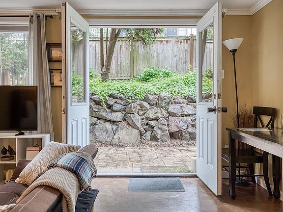 Step through the French doors onto your sizable private patio a rare feature that makes this studio feel like a true retreat. Nestled at the back of a quiet seven-unit building on a peaceful street, the home is framed by lush trees and greenery, creating a tranquil backdrop right outside your door. Large windows fill the space with natural light, while modern insulation and double-pane glass provide a calm, energy-efficient oasis in the middle of the city.