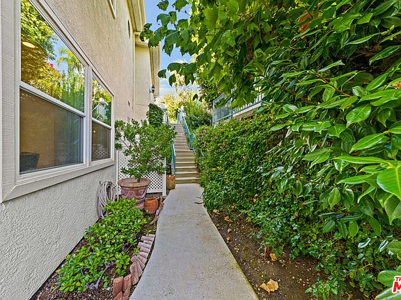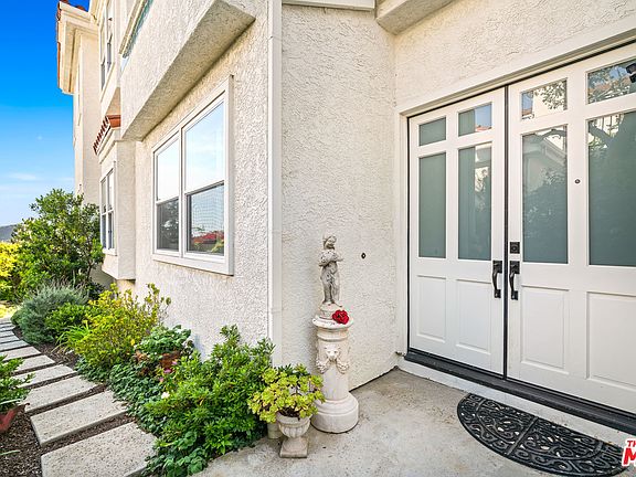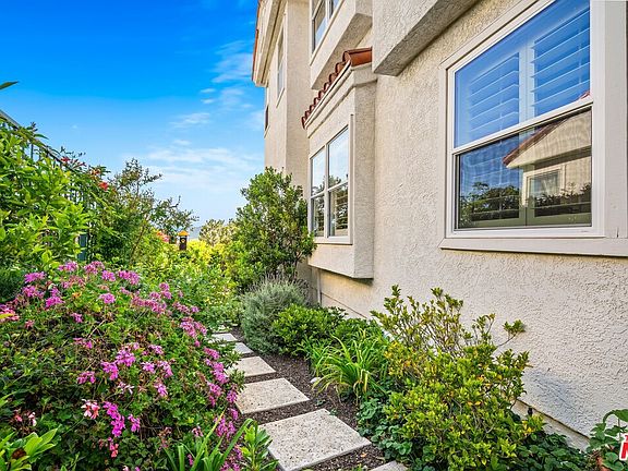 Stunning lower-level condominium in the sought-after Vista Catalina complex is an ideal place to all home due to its size, floor plan and lush landscaping. The gated walkway with stairs leading down to a private entrance is surrounded by a designer garden full of unique fruit trees and blooming plants offering total privacy and seclusion. The 3 bedroom and 3-1/2 bath condo includes a dining room, an open living room with wood burning fireplace and glass doors leading out to a private covered terrace with mountain views. The light filled kitchen opens to a sitting area and breakfast room surrounded by windows. The spacious primary bedroom has a gas fireplace, walk in closet and access to a large terrace. The primary bathroom is elegantly updated with a standalone tub and dual sinks. The 2nd bedroom can be utilized as an additional primary, offering a walk-in closet and access to a private atrium. The 3rd bedroom with an open archway can be used as a den, office or guest room. The private 2 car garage allows access to the unit directly. The complex provides a beautiful pool, spa and ample guest parking. This elegant condo is in a tranquil and luxurious setting and is one-of-a-kind due to the extensive landscaping and private grass area exclusive just for this unit. An ideal location and environment for a dog owner who desires outside space. There are stairs down to access this bottom unit, but the condo itself is single story and offers an ideal layout.