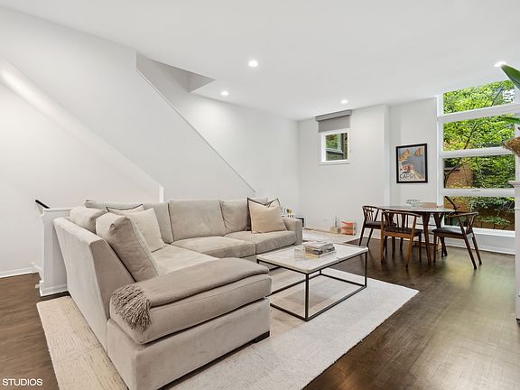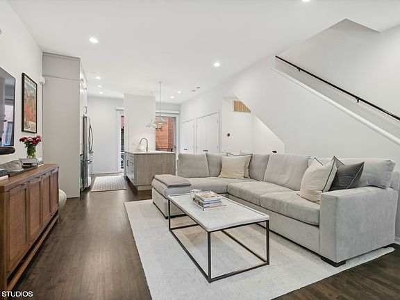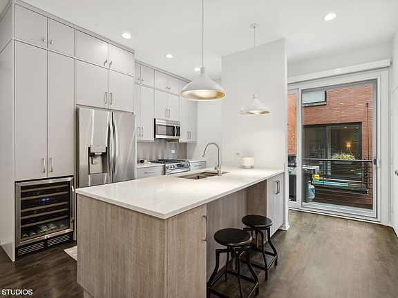 Discover refined living in this sophisticated Willow Court townhome at 2012 West Willow Street, Unit C in Bucktown. Elevated both in location and design, this townhome offers three well-appointed bedrooms and three full bathrooms, highlighted by a newly gut-renovated primary bath. The re-designed open kitchen is adorned with quartz countertops and herringbone backsplash. The upgraded custom cabinetry includes true pantry, under island cabinet storage and built-in bar, leading seamlessly into living/dining room with floor-to-ceiling windows that capture lush treetop views. Enjoy the luxury of having both a balcony of the primary living space, as well as your own private roof top featuring a built-in TV for seasonal entertainment. Additional conveniences include an attached garage and in-unit washer and dryer. Situated amongst the tranquility of tree-lined streets, this exquisite home is just steps away from the vibrant 606 trail, Damen Blue Line, and offers unparalleled access to premier shopping and dining destinations. Embrace the perfect blend of serene retreat and city excitement!