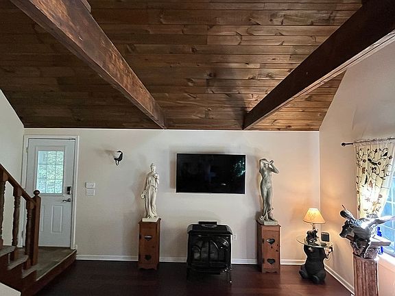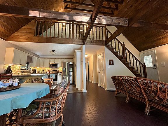 At 2.35 acres, this gem of serenity backs up to 412 acres of woodlands and the Bluestone National Scenic River. A year-round babbling brook borders the front, and towering, mature white oaks wrap around the wooden semi-A frame home of three bedrooms and two bathrooms.