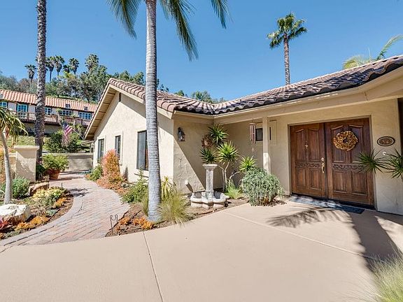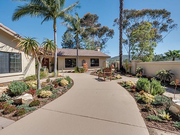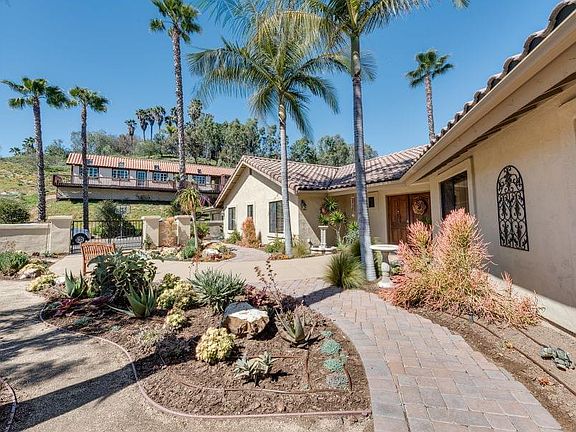 This single level 4 bedroom, 2.5 bath, 2,740 sqft home sits on a private 2.5 acre lot, surrounded by beautiful views of the mountains and backcountry hillside. The family room boasts vaulted ceilings, a cozy brick fireplace, ceiling fan and plenty of natural light. The kitchen features granite counter tops and a pots and pan hanger to keep everything organized. The home is finished with hardwood flooring throughout, new carpet in the bedrooms and crown molding in the octagon shaped living room. A spacious master bedroom with a walk-in closet, ceiling fan and french doors leads to an outdoor garden area. The accompanying master bathroom is detailed with tile counter tops, tile flooring and a separate soaking tub. The bonus room with laminate flooring is perfect for a home office or play room. 2-car garage with above stairs storage and a separate laundry room with a sink. The home features a new roof, electrical panel, rain gutters, paint inside and out, and an attic fan with 22 vents for the entire house. An inviting courtyard entry leads to a fountain, beautiful succulents plants, mature lemon, grapefruit, orange, guava and avocado trees; the sprinkler system is on a timer. Detached 1,100 sqft out building equipped with electrical, water and skylights. Bring your horse and farm animals.