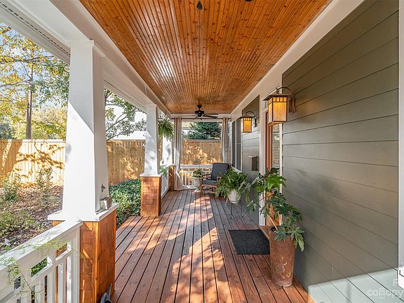 Charming Chantilly bungalow with a Craftsman vibe! Large comfortable front porch welcomes you into this 3 bedroom, 2.5 bath home nestled in the heart of Plaza Midwood and Elizabeth, enjoy the best of both with unsurpassed walkability! Come inside to a bright and soaring two story living room with gas fireplace. Timeless kitchen has stainless appliances w/ gas range, granite counters and tile backsplash. Primary suite on the main floor, tile shower in bath and laundry directly across from closet. French doors lead to the covered deck and backyard garden. Upstairs find 2 bedrooms - one with large walk-in closet, and the other with direct access to the second full bath. Also find a roomy loft hallway leading to the covered balcony overlooking the neighborhood and offering winter views of Uptown. The fully fenced backyard garden provides a peaceful and secluded retreat w/ landscape lights, stone patio and pathways, shed, waterfall and pond. Side yard fence does encroach into unused alley.