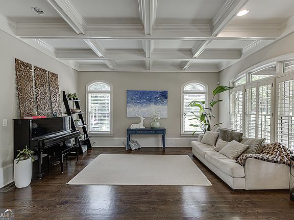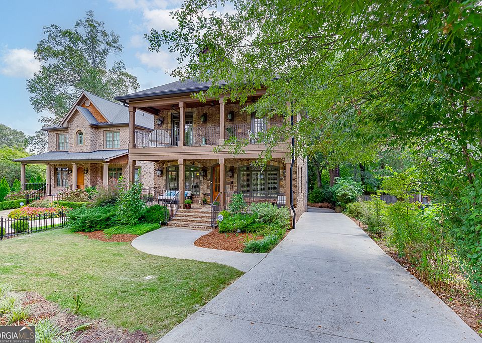 ~ A Perfect location right on the edge of Chamblee and Brookhaven, this home is walkable/bikeable to the Chamblee RAIL TRAIL with easy access to all the exciting restaurants and activities in Chamblee. This four-sided brick home features double covered front porches with 8 total lanterns, cedar ceilings, solid wood columns, and a stunning wooden arched front door. The 3 car garage is perfect for that 3rd driver in the family, or you can use it as a workshop space. All upper-level bedrooms have tray ceilings, walk-in closets, and their own private bathrooms. As you enter through the home, you step into a welcoming open floor plan with 10ft tall ceilings throughout. The dining room is located to the left, which boasts tall judges paneling on three sides. A second living room is on the right with a stunning coffered ceiling. The windows in these two rooms have plantation shutters, and the ceilings are adorned with elegant crown molding. Rich dark hardwood floors are throughout the main level, surrounded by substantial base molding. The main living room opens to the breakfast room and kitchen, and has a door that leads to the back deck. A wall of multiple built-ins flanks the tiled fireplace, and there are surround sound speakers so you could enjoy the game on a wide screen TV with moveable arm. This room will hold plenty of guests as you can see by the huge sectional sofa. A sunny breakfast room overlooks the deck and yard, and both it and the kitchen have dark wood beams that run across the ceiling. An angled breakfast bar defines the kitchen from the living room and breakfast room which enables your family and guest to freely chat and mingle. The kitchen has custom painted wood cabinets, granite countertops, recessed and pendant lights, stainless steel appliances which include double ovens and a full-sized microwave. A half bath is located on the main level for easy access. The oversized primary suite features its own fireplace and plenty of space for large pieces of furniture or room for a desk. French doors open out to the top floor covered patio. Double doors lead you into the en suite bathroom, highlighted by his and her large separate vanities, a whirlpool tub, a separate water closet, and large frameless enclosed shower. The primary bathroom also has a door which leads out to the second-floor covered deck. Beyond the bathroom is a custom walk-in closet. Each oversized secondary bedroom has a walk-in closet and an en-suite full bathroom. The laundry room is also located on the upper level for your convenience. When you enter into the basement from the 3-car garage there is a built-in storage bench for dropping all your coats, shoes, and bags. There is a secondary large living room in case a family member wants to watch something different from the people upstairs. If a family member or guest wants extra privacy, there is a huge bedroom and en-suite bathroom are also located on this level. There are over 6 grocery and many other stores nearby including Costco, Walmart, Publix, Whole Foods, Kroger, Ace Hardware, Lowes, and Marshalls. There is an abundance of great restaurants just a few minutes away in Downtown Chamblee, Brookhaven and along Buford Highway. Montgomery school bus stops directly in front of the home (both pickup and drop-off). The property is 5 minutes to I 285 and I 85, which gives you fast access to all parts of the city. The sellers have a rendering and plans for a pool which will be shown on a tablet when you go into the house.