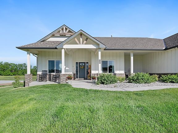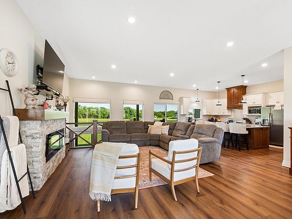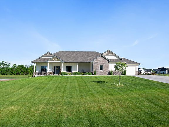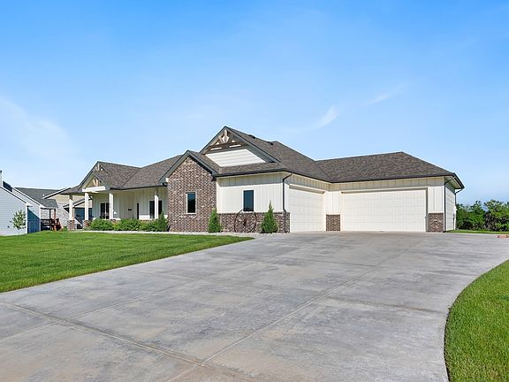 Welcome to your luxury dream retreat by the lake! This newer ranch home offers unparalleled comfort and style, nestled on a sprawling 1-acre lake lot. Boasting 4 bedrooms, 3.5 baths, and a spacious 4-car garage, this residence sits in Goddard Eisenhower Schools and is designed for luxurious living. Outside, be greeted by the timeless elegance of ranch-style trim, ensuring exceptional curb appeal. The zero-entry design welcomes you into an expansive living space adorned with luxury vinyl plank flooring, creating an atmosphere of warmth and sophistication. The heart of the home is the open-concept great room, complete with an electric fireplace, perfect for cozy evenings with loved ones and formal dining room. The wall of windows in the living and kitchen areas offer breathtaking lake views, bringing the tranquility of the outdoors inside. Access to the backyard deck from the great room invites seamless indoor-outdoor living and entertaining space. Prepare culinary delights in the huge kitchen, equipped with a large island, granite countertops, tile backsplash, soft-close cabinets, and a walk-in pantry. Appliances including stove, dishwasher, disposal, and water softener are all included, making meal prep a breeze. A convenient half bath with a marble countertop is just steps away. The split-bedroom layout ensures privacy, with the primary suite offering an oasis of comfort and natural light. The primary bath features a luxurious 6x4 tiled walk-in shower, tile flooring, granite countertops, double sinks, and a large walk-in closet with direct access to the laundry room. Additional main level bedrooms share a well-appointed hall bath with marble countertops and a decorative vanity. A drop zone off the garage entry provides organizational convenience. Descend to the mid-level walk-out basement, where endless entertainment awaits. A sprawling family room and game room plus the wet bar (11x9) with granite countertops and luxury vinyl plank flooring offer the perfect space for gatherings. A third full bath and fourth bedroom provide ample accommodation for guests, while hidden storage under the stairway maximizes space. Outside, enjoy the serenity of lake views from the covered deck and patio, perfect for alfresco dining and relaxation. An irrigation well and sprinkler system ensure a lush, vibrant lawn, while a rear garage door adds convenience. Owned water softener and high efficiency HVAC with humidifier. Close to restaurants, churches, parks and just a short drive to West Wichita conveniences. Don't miss the opportunity to make this stunning lakefront retreat your own. Schedule your showing today and experience luxury living at its finest! Offers will be reviewed daily after showings are completed at 7 p.m.
