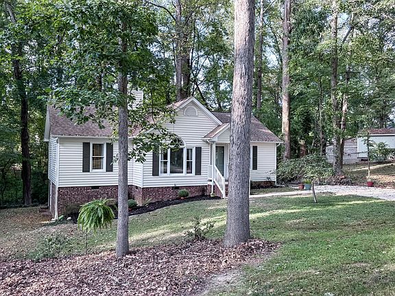 Welcome to this charming ranch-style home tucked at the end of a quiet cul-de-sac in the coveted White Oak Plantation neighborhood. With 3 bedrooms and 2 baths across 1,213sf, this home presents a cozy yet open layout ideal for both everyday living and entertaining. Vaulted ceilings over the living area draw the eye upward, while a stone fireplace serves as a focal point and adds warmth. The remodeled eat-in kitchen features beautiful marble counters and island top that brighten the room, along with plentiful cabinets and durable surfaces for everyday use. Elegant French doors open to the rear deck, seamlessly blending indoor and outdoor spaces and offering a private, wooded backdrop for relaxation or entertaining. Throughout the home you'll find new luxury vinyl plank flooring that elevates the appeal and provides very easy maintenance. The walk-in crawlspace offers storage with power and shelving. The exterior is designed for low upkeep, and the .64-acre lot size ensures generous yard space with amazing privacy and nature. Ideally located near shopping, dining, and major roads (Highway 70 & I-40), the property balances quiet, residential living with easy access to amenities.