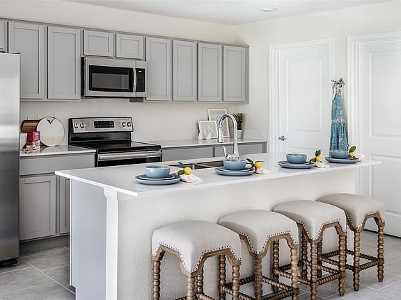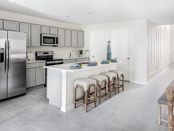 Why wait to build when you can own this stunning former model home, perfectly situated on a premium pond-view lot with no rear neighbors—an ideal backdrop for creating your private outdoor oasis. Designed for both comfort and functionality, this spacious two-story floor plan separates living areas for maximum tranquility. The first floor features an open-concept design that seamlessly connects the kitchen, dining room, and living room—perfect for both family living and entertaining. The owner’s suite is conveniently located on the main level, offering a private retreat with a spa-inspired bathroom and a generous walk-in closet. Upstairs, four additional bedrooms are complemented by a versatile loft that serves as an additional gathering space for the household. The gourmet kitchen is both stylish and practical, boasting a stainless steel appliance package, a large center island with built-in sink and pull-down faucet, a multicycle dishwasher, and a spacious walk-in pantry. The dining area flows naturally into the living room, where sliding glass doors provide abundant natural light and easy access to outdoor living. With five bedrooms in total, this home is perfectly suited for large or multigenerational families, providing everyone with their own private haven. The upstairs bathroom is thoughtfully designed with dual sinks to streamline busy routines, while the open loft offers endless flexibility for work, play, or relaxation. Life at Storey Creek means enjoying resort-style amenities every day—swim in the community pool, play a game of tennis or basketball, walk the dog in the park, or let the kids run on the playground. Plus, lawn care is included, giving you more time to enjoy it all. With easy access to top schools, shopping, dining, and Central Florida’s best attractions—including Disney, Universal, Lake Nona Medical City, and Orlando International Airport—you’ll love the unbeatable convenience this location offers.