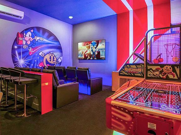 Welcome to 2013 Oak Creek Loop, a beautifully upgraded retreat in one of Davenport’s most desirable resort communities. This spacious home blends modern design, exceptional amenities, and an unbeatable location moments from Orlando’s world class attractions. Step through the front door and you are welcomed by soaring ceilings and an open concept layout that feels both stylish and relaxed. The great room offers generous gathering space with Mid Century inspired touches, perfect for everyday living and hosting friends and family. Just beyond, the chef’s kitchen delivers the ideal blend of form and function with stainless appliances, crisp white cabinetry, a large breakfast bar, and a dining area that can easily accommodate group meals or cozy weeknight dinners. Movie lovers and gamers will appreciate the private theater and arcade space, complete with plush seating, an oversized screen, and classic arcade favorites. When it is time to unwind, head outside to your private screened pool and spa. There is plenty of room to lounge, grill, dine, and enjoy Florida’s sunshine year round. Upstairs, a versatile loft provides a second living area perfect for working from home, watching TV, or hosting game nights. Families will adore the one of a kind themed bedroom designed as a frontier style desert hideaway with climbing features, slides, and hidden bunk spaces. The walk in closet even opens up to a secret game room that kids will love. The additional bedrooms offer peaceful, hotel style comfort with king and queen suites located both upstairs and downstairs. Each features thoughtful design, high quality finishes, and private or nearby baths. The upstairs primary suite is especially spacious with a walk in closet and a generous en suite bathroom with dual sinks, soaking tub, and separate shower. Living in this community means having incredible amenities at your fingertips. Homeowners enjoy access to a resort pool with lazy river, water slide, fitness center, tennis courts, scenic walking areas, and the exclusive Villatel Village playground and event spaces. All of Orlando’s top destinations are within easy reach, including Disney, Universal, SeaWorld, International Drive, and major shopping and dining districts. Whether you are seeking a primary residence, a vacation home, or a turnkey investment property, 2013 Oak Creek Loop offers unmatched flexibility, comfort, and lifestyle appeal. Schedule your private showing today.