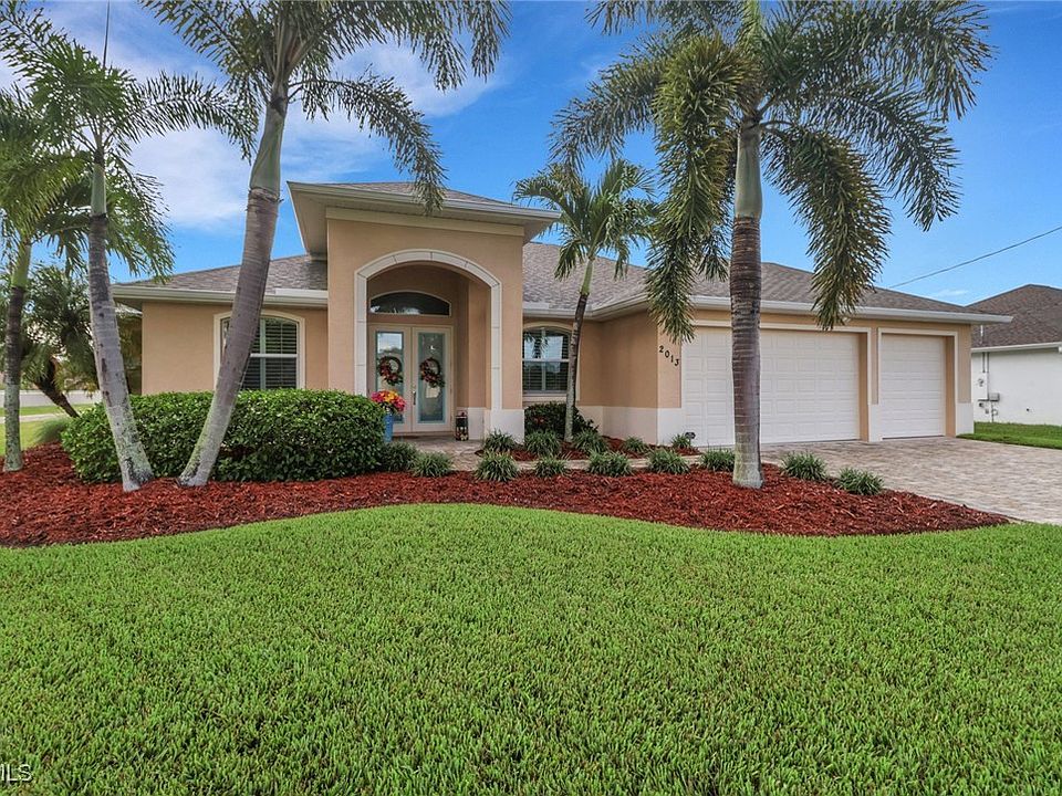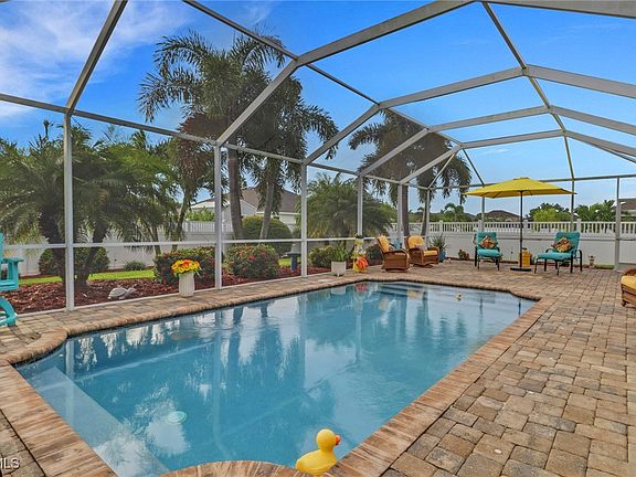 Welcome to your dream home in the heart of highly desirable SW Cape Coral, where the Florida lifestyle shines bright! This pristine, model-like home, just shy of 1,900 sqft, radiates pride of ownership and offers the perfect blend of luxury, comfort, and tropical charm. As you approach, the meticulously manicured landscaping and majestic royal palm trees set the stage. You are welcomed to tile flooring that flows seamlessly throughout, complemented by elegant plantation shutters, hurricane impact windows/doors, 8 ft. doors, and 5.25-inch baseboards that add a touch of sophistication. In the kitchen you will find an abundance of cabinetry, granite countertops, and stainless-steel appliances. Perfect for entertaining, this open kitchen flows effortlessly into the spacious living areas. Retreat to the luxurious main suite, featuring a tray ceiling, a spacious walk-in closet, and a bathroom with dual sinks and frameless glass shower. The second bathroom conveniently opens to the pool area, making outdoor living a breeze. Your private oasis features a heated pool that comes equipped with an expansive pool deck, salt cell, and screened pool cage. Enjoy the morning sun with rear facing eastern exposure. The lanai is equipped with Storm Smart screens for added protection. Whether you're lounging by the sparkling pool or hosting friends on the patio, this outdoor space is designed for relaxation and fun. The fenced-in yard is perfect for pets or kids, providing a safe and spacious area. Car enthusiasts and hobbyists will love the oversized 3-car garage with a sleek epoxy floor, providing ample space for vehicles, storage, or a workshop. Near restaurants, shops, golf courses, and boat ramps, this location is truly unbeatable! This is the Florida home you’ve been dreaming of, inquire for more details!