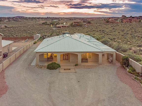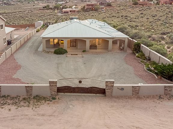 BEAUTIFUL custom home situated on half acre private Lot in RR ESTATES! GATED, Stacked stone entrance offers gorgeous views & privacy, many recent improvements, paint, landscaping, finished oversized garage, separated Master with views, & huge walk-in closet. Granite Counters , stylish backsplash in chef's designer KT , custom cabinets, built in GE Profile SS appliance package! Tray & elevated ceilings, custom arches & nichos, lovely outdoor dining spaces . Finished oversized garage has plenty of storage for toys. Amazing front portal to gaze at Sandia Mtn Range, Custom sliding gate at entrance for security, good-sized secondary rooms, upgraded metal roof, patio has ceiling fans and privacy! Convenient location, PRICE IMPROVED TO SELL FAST! Electrical in garage all updated & improved!