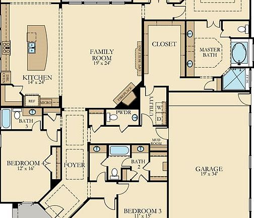 The stunning single-story Victoria plan by Village Builders features an inviting entry foyer that opens onto a generous family room with a cozy corner fireplace and the option to add lovely built-in shelving. The open island kitchen adjoins a beautiful formal dining room with access to a covered rear patio. The spacious master suite boasts an elegant en suite master bathroom with separate shower and tub, dual sinks, private toilet enclosure, and large master closet with access to the handy utility room. The four car garage features hallway access to a convenient mud room, powder bath and the utility room. The Victoria plan also offers a handsome study with the options to add beautiful ceiling beams and built-in shelving. The Victoria floor plan also offers the option to add a fifth car garage, in Vistas at Klein Lake. The Victoria floor plan options may differ in other communities.