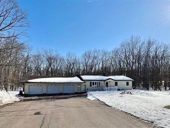Peaceful setting on 10 wooded acres! Solidly built, three bedroom ranch home with three car garage and floor drain. Spacious living room and kitchen with lots of natural light streaming in the large bow windows. Updated kitchen with ample Corian countertops and Larson Cabinets. Spend time viewing nature and wildlife from the comfort of your 3-season sunroom with sky lights. Large primary bedroom has a full bath and a nice view of the backyard. Dry basement with laundry sink, walk-out opens to large backyard. Apple trees, Black walnut tree, Evergreen trees, with a mix of Oak and hardwoods covering the majority of the property. Short drive to Lake Wissota State Park. Cadott/Chippewa Falls School Districts, call to confirm.