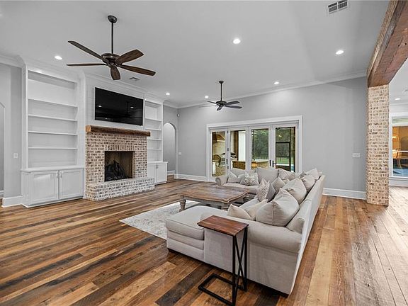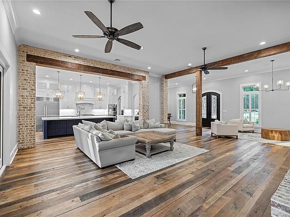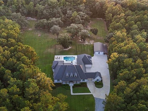 Welcome to River Crest subdivision, this 2022 custom home sits on a private cul-de-sac with 6 acres of serene privacy and gorgeous oak trees. Designed with timeless detail, this 5-bedroom, 4.5-bath home showcases reclaimed distillery wood floors, reclaimed beams, and an open-concept living design. Primary suite features large walk in shower, soaking tub, double separate vanities, 2 walk in custom closets. The heart of the home features a chef’s dream kitchen with an 11-ft quartz island, Thermador appliances, Sub-Zero refrigerator, double oven, ice maker, and wine cooler. Accordion doors open the living room to a screened outdoor patio with a full outdoor kitchen and gas fireplace for entertaining year-round. The home also offers a formal dining room, sitting area, breakfast nook, office, and an upstairs bonus room. Luxury continues with a Gunite heated mineral pool and spa, pool half bath, and a laundry room complete with a dog-washing station and direct pool access. A 30x50 workshop with 10-ft overhang, 3-car garage plus Porte Cochere, whole-home generator (KW 22), and water filtration system add function to style.