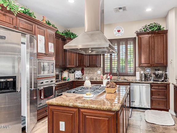**OVER 1/3 ACRE LOT that backs up to a walking path and green space!** SINGLE STORY floorplan with 3BD/3BA + DEN and over 3,000sf. Private courtyard entrance with custom pavers and cozy fireplace. Extended covered back patio, SPARKLING POOL and BUILT IN BBQ in the EXPANSIVE BACKYARD!!! Gourmet, upgraded Viking stainless steel appliances, upgraded cabients and granite countertops in the kitchen, and travertine flooring throughout the home. Highly desirable, quiet, private community with parks and walking paths, open spaces, and easy proximity to QC Marketplace, upscale retail and restaurants, and A rated schools. Don't miss this Queen Creek gem!