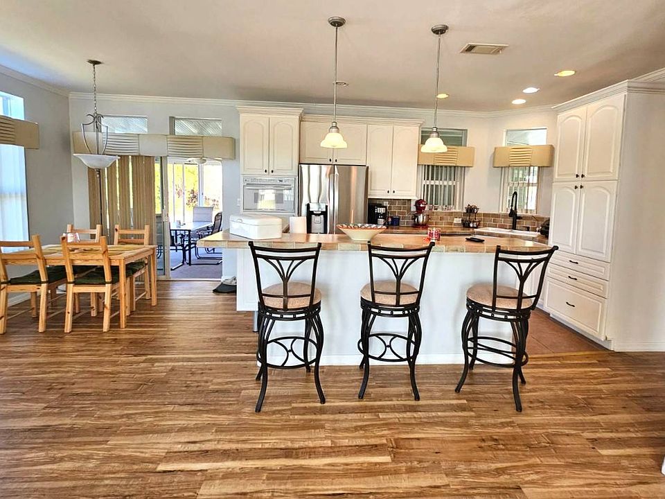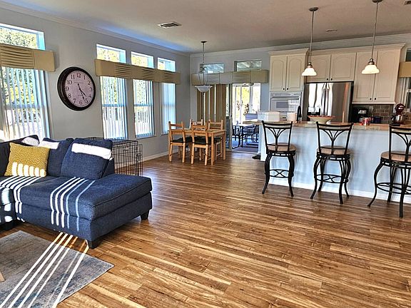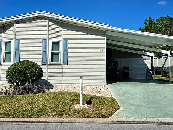 This 2-bedroom, 2-bath home (plus a den) is situated on a leased lot within a 55+ resort-style manufactured housing community. With 1,496 square feet, it features tape and textured walls, crown molding, and both laminate and tile flooring throughout. The house has been freshly painted, boasts double-pane windows, and offers wide hallways for easy movement. Upon entry, you'll find a versatile den-ideal for a home office or craft space. The kitchen, living room, and dining area are designed in an open layout with plenty of natural light from numerous windows. The kitchen includes a counter-height bar, cook-top stove, utility sink, and select stainless-steel appliances. The primary bedroom is located at the front of the house and comes with a spacious walk-in closet. The ensuite is equipped with double vanities, a garden tub, shower stall with grab bars, and extra storage cabinets. The guest bath features a shower/tub combination, and the laundry room houses the washer and dryer. At the back, there's a lanai with glass windows that provides a peaceful view of a small pond. An extended garage with an automatic door opener can accommodate both a small vehicle and a golf cart. The property also includes a powerful 10,000-watt dual fuel portable gas generator capable of running the entire house, )except for the AC unit.) The home is offered unfurnished, but a golf cart is included. The metal roof was installed less than six weeks ago, and the AC unit was replaced in 2017. This home is on leased land in a community where residents pay a monthly lot lease ranging from $1100.00 and up. Age restrictions apply and buyers must pass a background check, credit check and meet financial requirements for residency. BUYERS DO NOT OWN THE LAND. Monthly lot lease fees include the use of two pools, two hot tubs, a fitness center, tennis courts, bocce ball courts, pickleball, tennis, horseshoes, shuffleboard, cornhole, and countless indoor and outdoor activities. The onsite bar and grill feature daily food and drink specials and provides monthly entertainment. Included in the monthly fees are lawn mowing, biweekly trash pickup and a 24-Hour staffed guard gate. The community has two 18-hole golf courses where residents may purchase a golf membership or a 'pay as you play membership'. All listing information is deemed reliable but not guaranteed and should be independently verified through personal inspection and/or by appropriate professionals. The buyer assumes full responsibility for obtaining all current rates of lot rent, fees, or pass-on costs associated with the community, park, or home from the community/park manager.